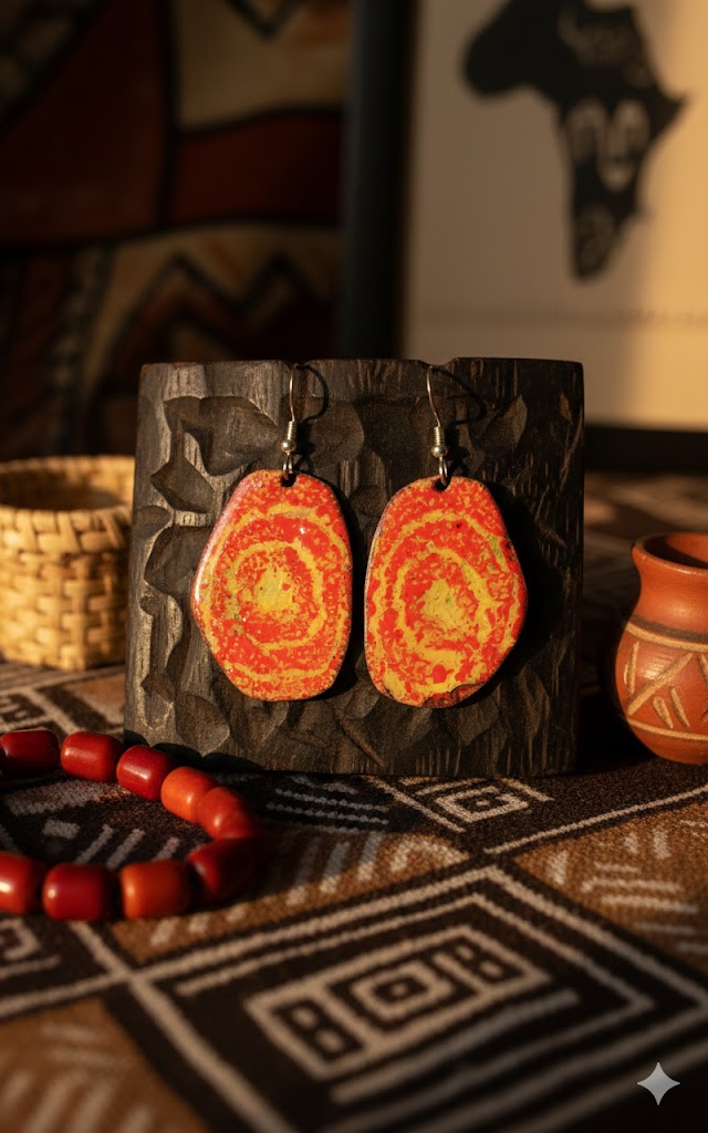 Bringen Sie Wärme und Energie in Ihren Look mit diesen ausdrucksstarken Statement-Ohrringen. Die organische Form und das leuchtende Farbmuster machen jedes Paar zu einem unverwechselbaren Einzelstück.