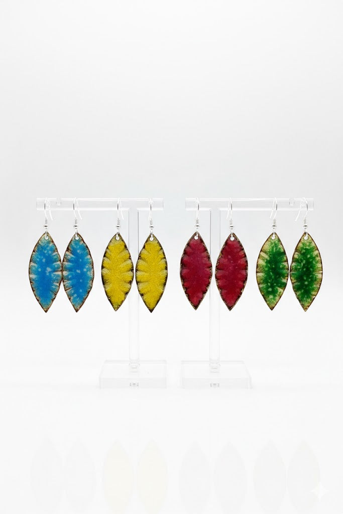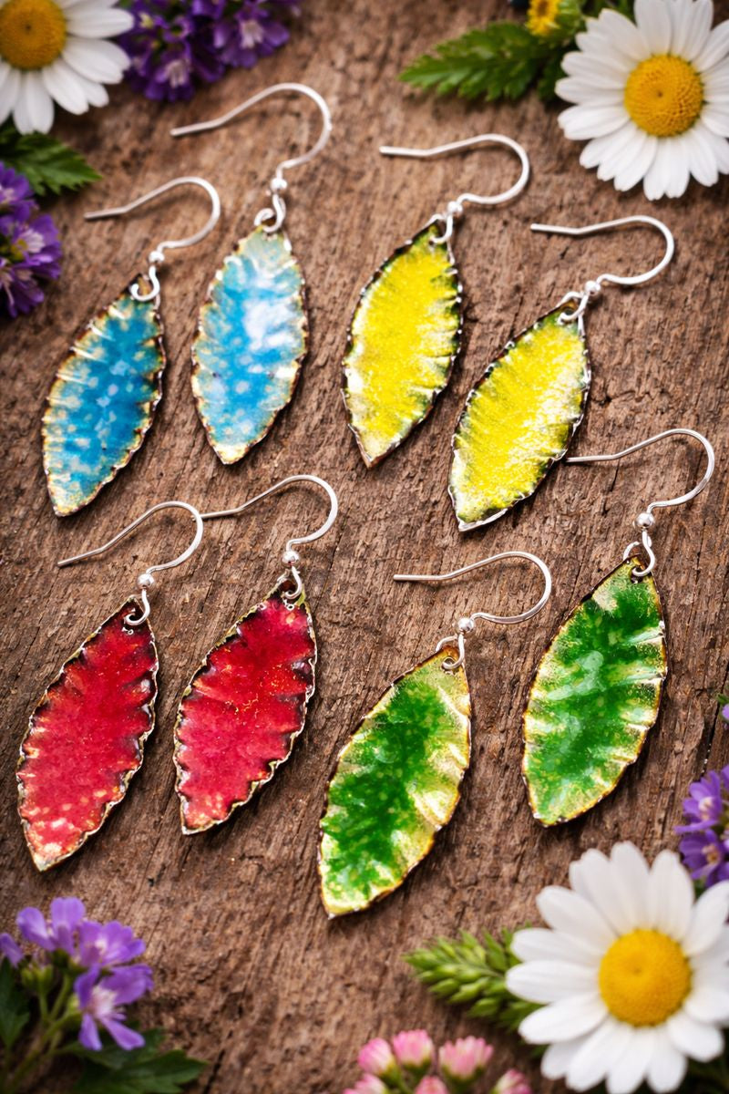 Bringen Sie Farbe in Ihren Alltag! Diese leuchtenden Ohrringe in stilisierter Blattform sind ein wahres Statement für Naturliebhaber und Individualisten. Ob in strahlendem Himmelblau, sonnigem Gelb, kräftigem Rubinrot oder frischem Grasgrün – jede Farbe erzählt ihre eigene Geschichte. Durch die kunstvolle Emaillierung entsteht eine lebendige, leicht strukturierte Oberfläche, die das Licht wunderschön reflektiert. Da jedes Paar von Hand gefertigt wird, erhalten Sie ein echtes Schmuckstück-Unikat.