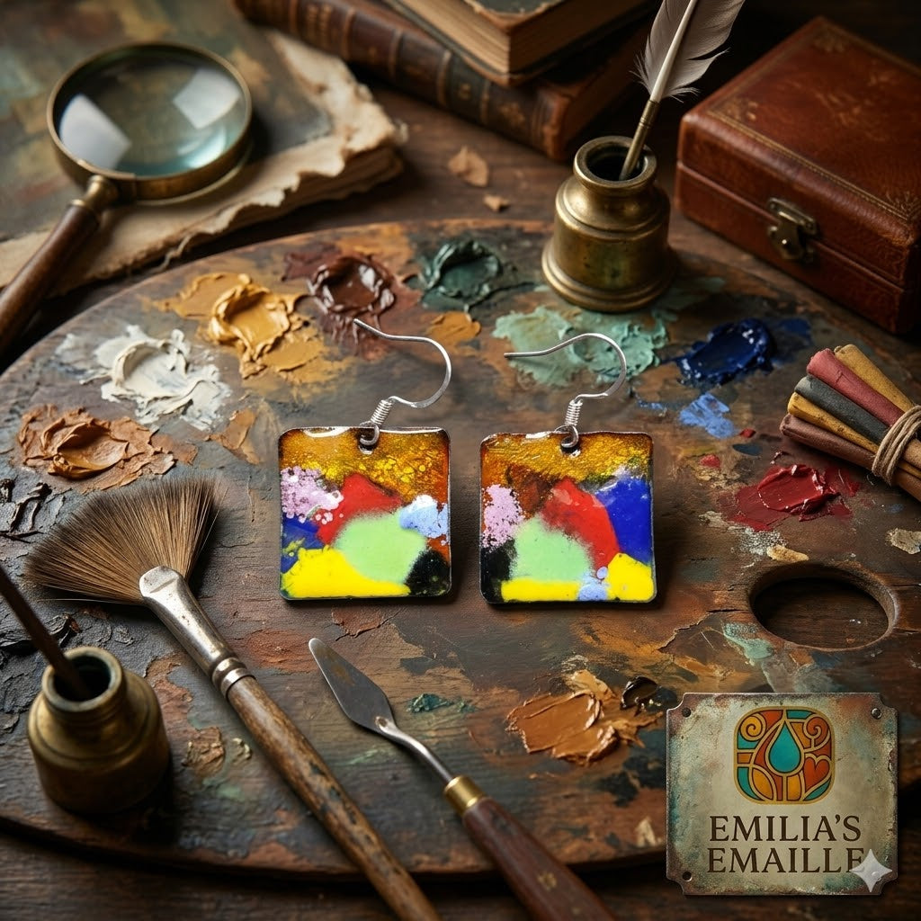 Tauchen Sie ein in die atmosphärische Welt eines Künstlerateliers der Renaissance. Diese einzigartigen, quadratischen Ohrringe sind weit mehr als einfacher Schmuck; sie sind Miniatur-Leinwände, auf denen Feuer und Glas die lebendige Palette eines alten Meisters nachempfunden haben.