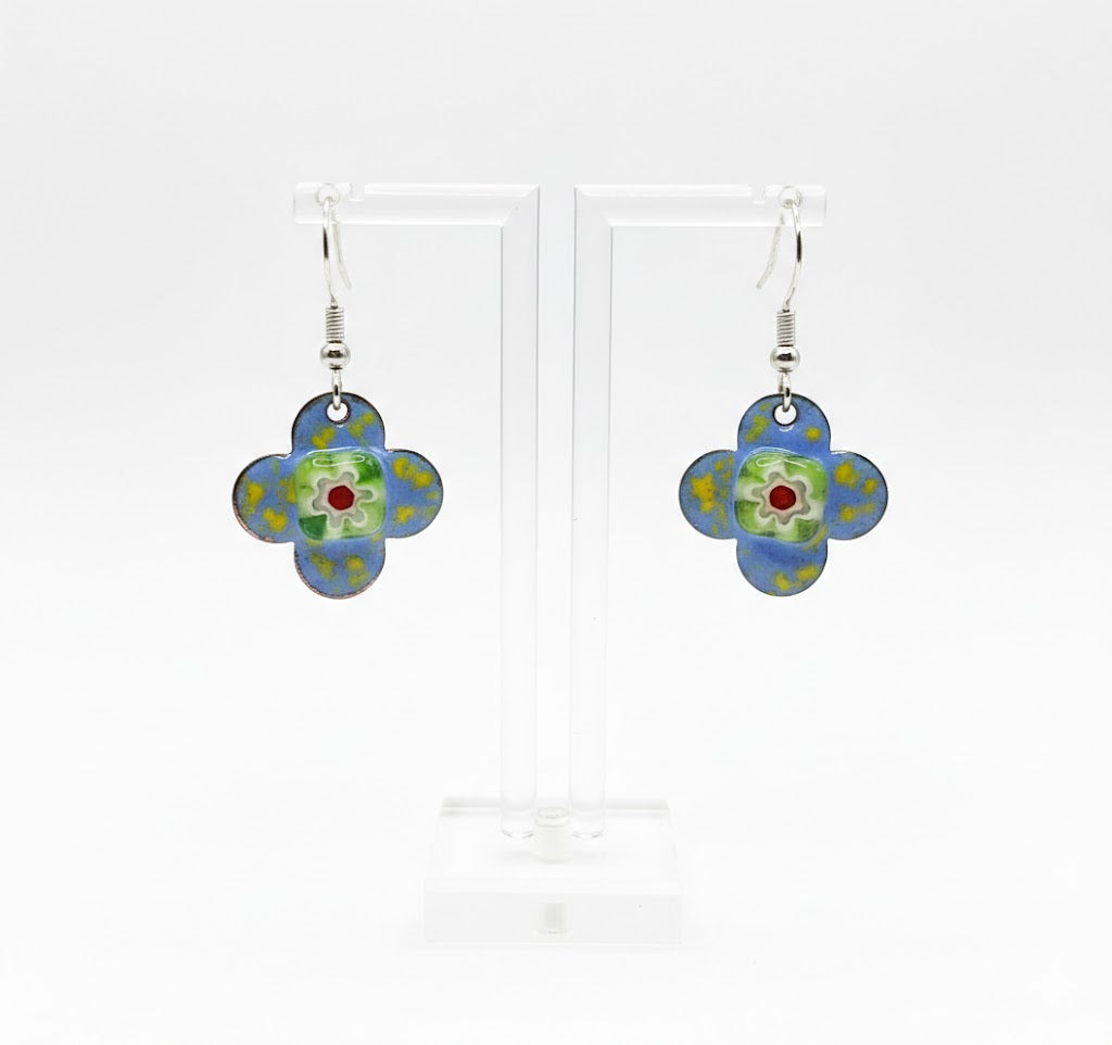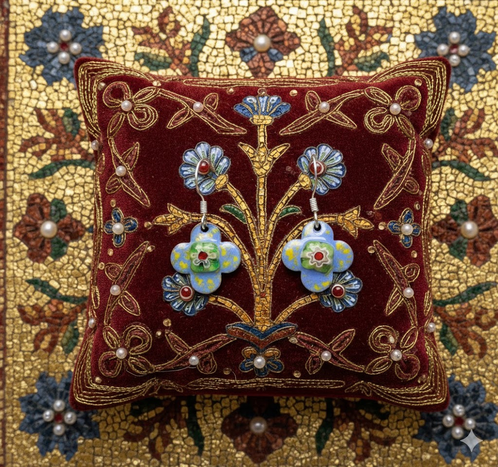 Tauchen Sie ein in den Glanz vergangener Epochen. Diese exklusiven Ohrringe in Form eines traditionellen Quadrifoliums vereinen byzantinische Mystik mit moderner Handwerkskunst. Das leuchtende Himmelblau, kombiniert mit floralen Millefiori-Akzenten, erinnert an die prachtvollen Mosaike des alten Konstantinopels. Jedes Paar wird in liebevoller Handarbeit gefertigt, wodurch die individuelle Struktur der Emaille jedes Stück zu einem kostbaren Unikat macht.
