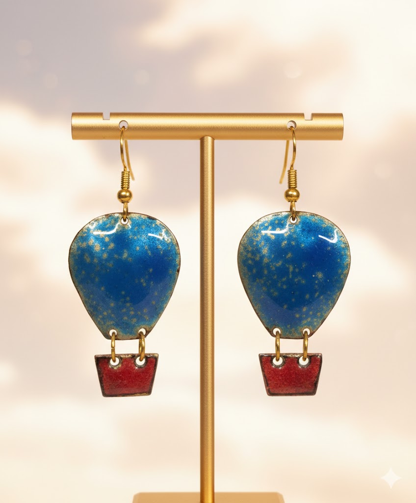 Träumen Sie sich über die Wolken! Diese einzigartigen Ohrringe in Form von Heißluftballons sind ein verspieltes Statement-Piece für alle, die das Besondere lieben. Die Kombination aus intensivem Blau und feurigem Rot macht sie zu einem unverwechselbaren Blickfang.