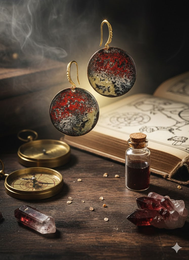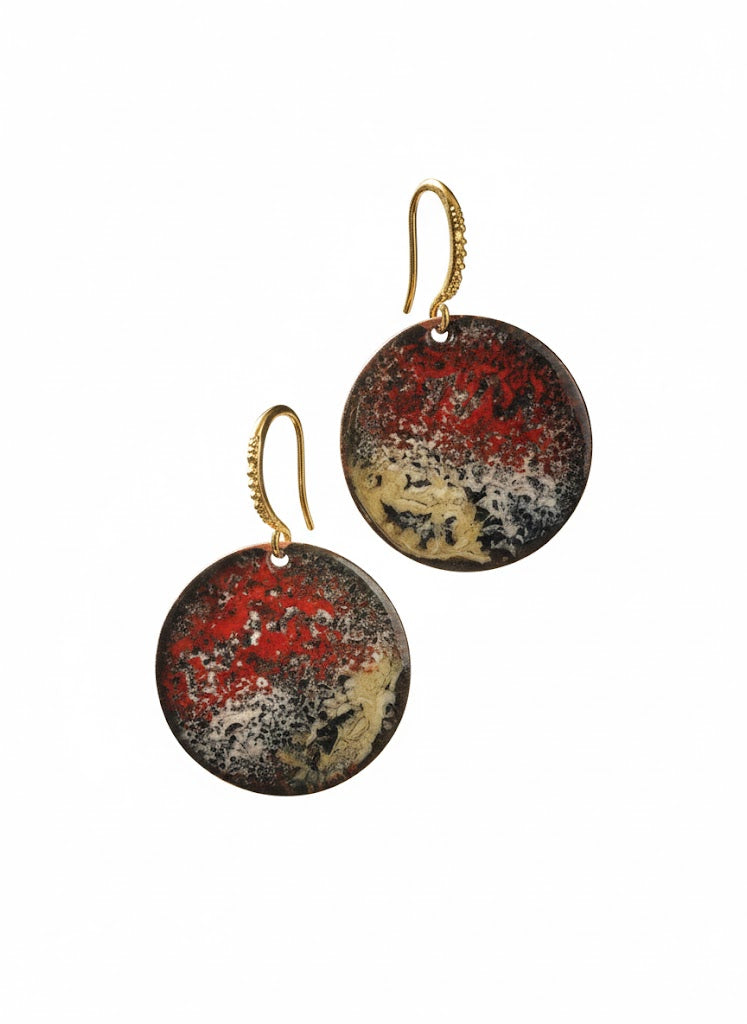 Erleben Sie die faszinierende Verbindung von Feuer und Kunst. Diese runden Statement-Ohrringe bestechen durch ihr ausdrucksstarkes Muster in Rot, Weiß und Schwarz, das an glühende Lava oder ferne Galaxien erinnert.