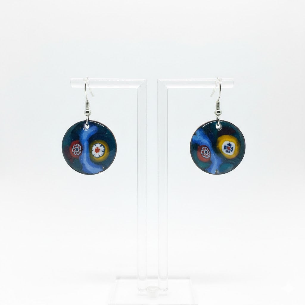Handgefertigte emaillierte Ohrringe aus Kupfer mit Hacken. Der Ohrring hat eine Gesamtlänge von 3,5 cm