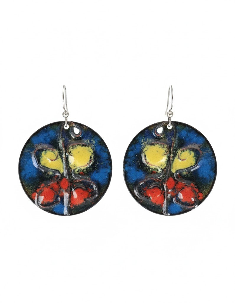 Design: Runde Emaille-Scheiben, die ein abstraktes Schmetterlingsmotiv in leuchtendem Gelb, kräftigem Rot und tiefem Blau zeigen.