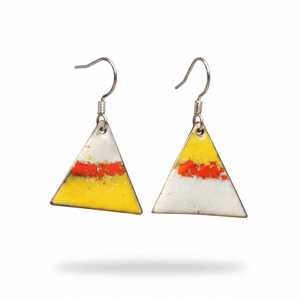 Beschreibung: Setzen Sie ein klares Statement mit diesen einzigartigen Emaille-Ohrringen in moderner Dreiecksform. Inspiriert von der klaren Ästhetik chinesischer Landschaften, verbindet dieses Accessoire leuchtendes Sonnengelb mit einem kräftigen roten Akzent auf reinweißem Grund.