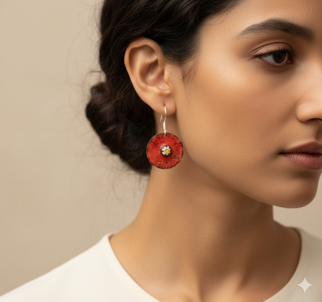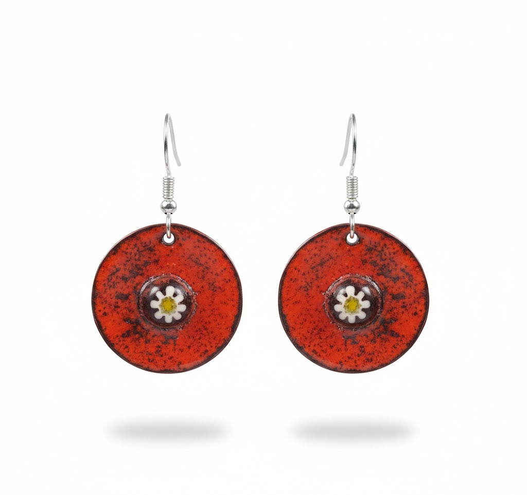 Handgefertigte emaillierte Ohrringe aus Kupfer mit Hacken. Der Ohrring hat eine Gesamtlänge von 3,5 cm